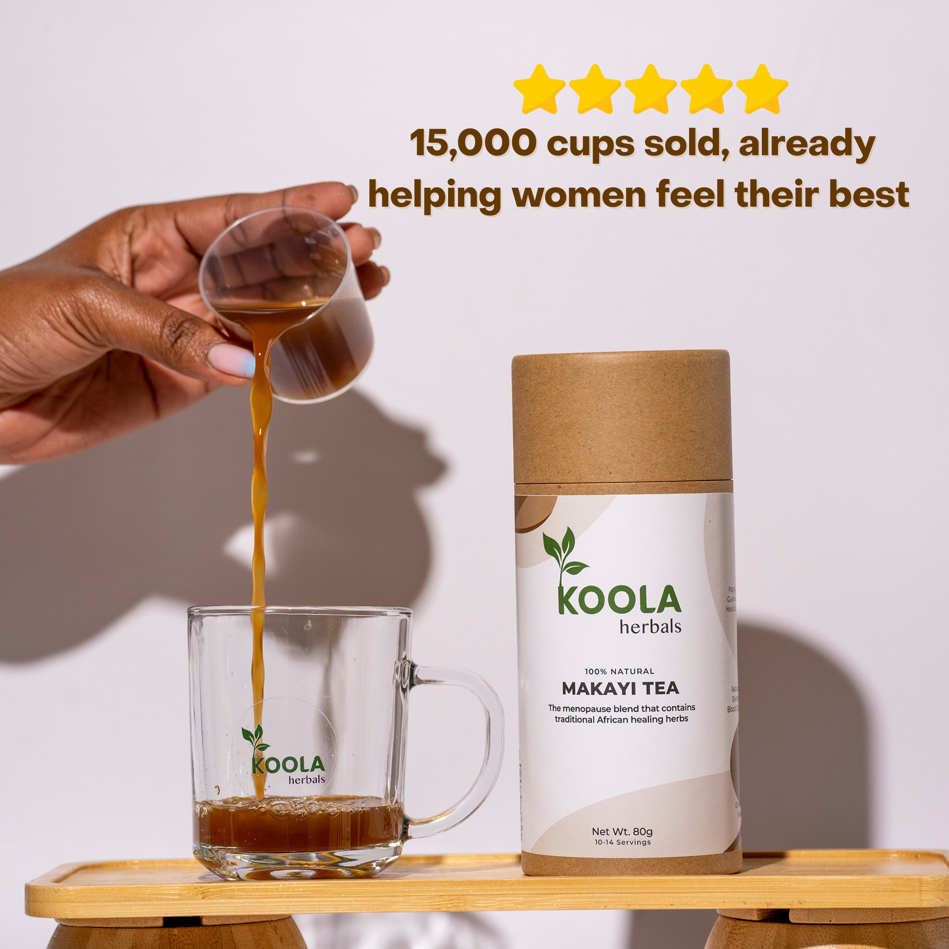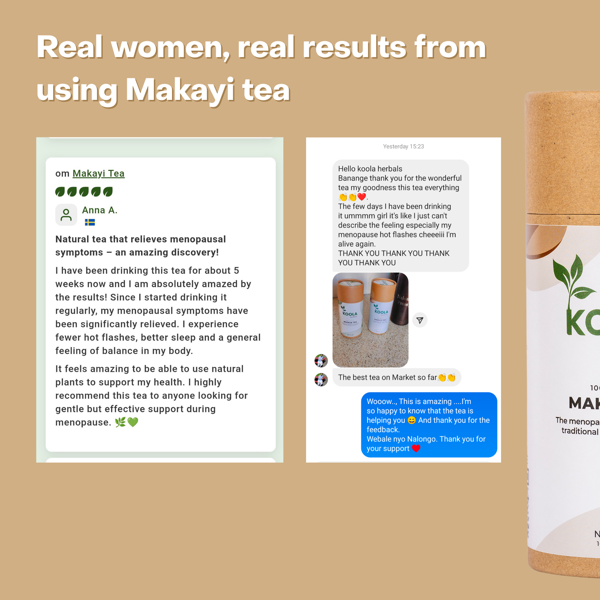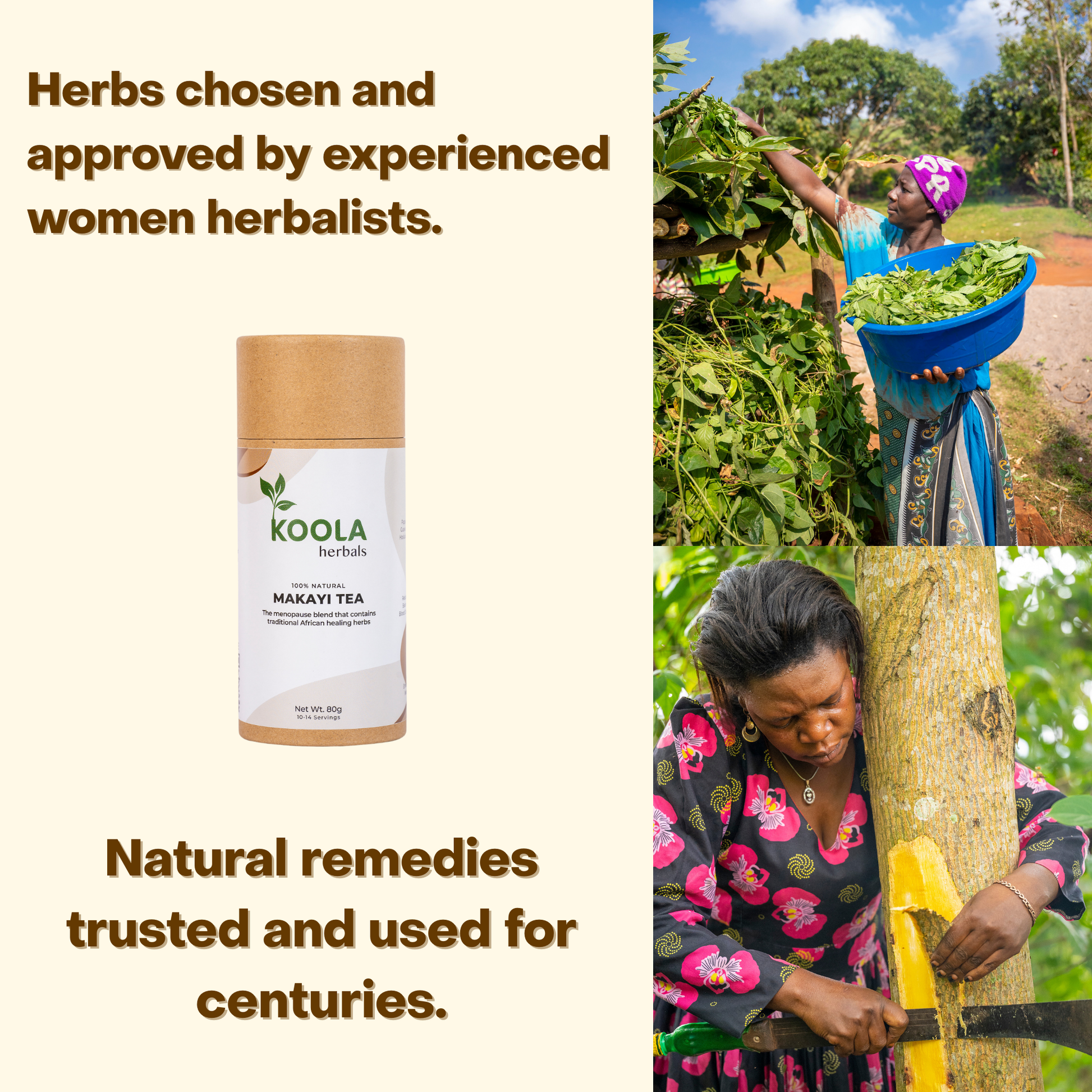 Avocado leaf, Guava leaves, und Papaya leaf in Makayi Tea enthalten natürliche Verbindungen, die helfen, die Körperwärme zu regulieren, das hormonelle Gleichgewicht zu unterstützen und plötzliche Hitzegefühle sowie Nachtschweiß, die mit der Menopause verbunden sind, zu reduzieren.