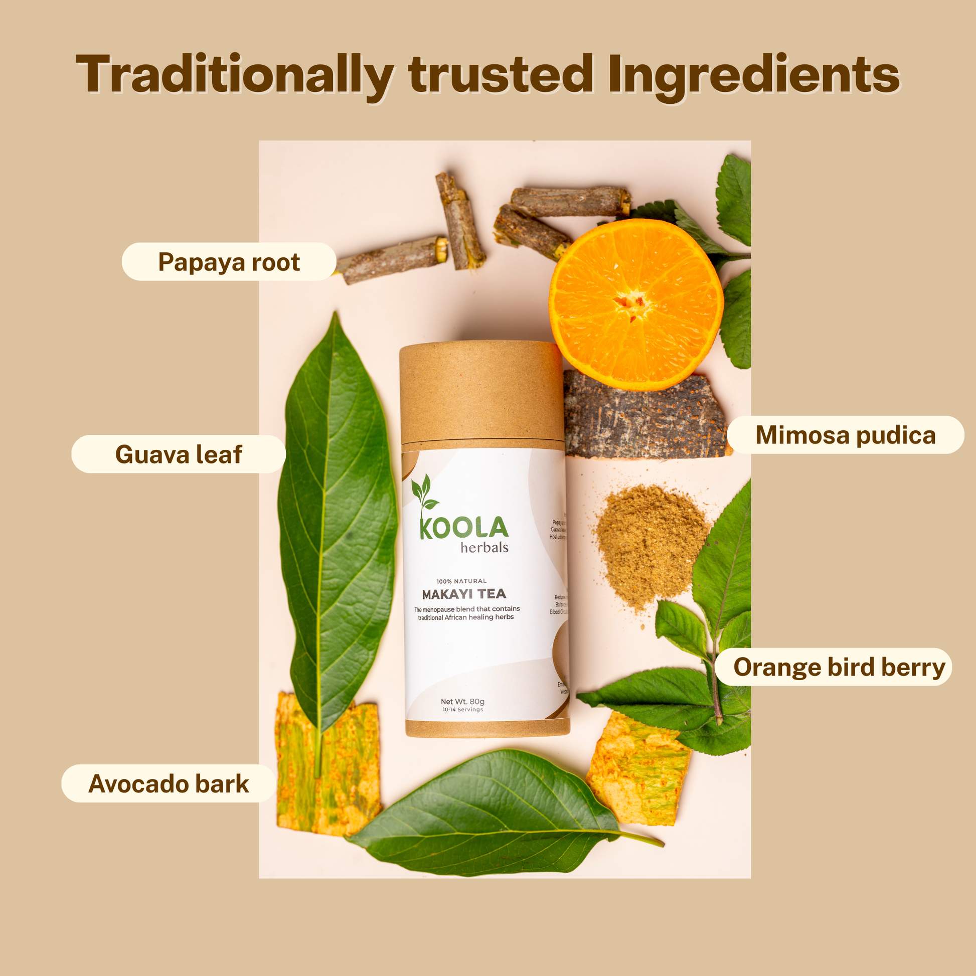 Makayi Tea łączy Avocado leaf, Guava leaves, oraz Mimosa pudica, aby uspokoić nerwy, złagodzić uczucie niepokoju i wspierać spokojniejszy sen, zmniejszając intensywność niespokojności.