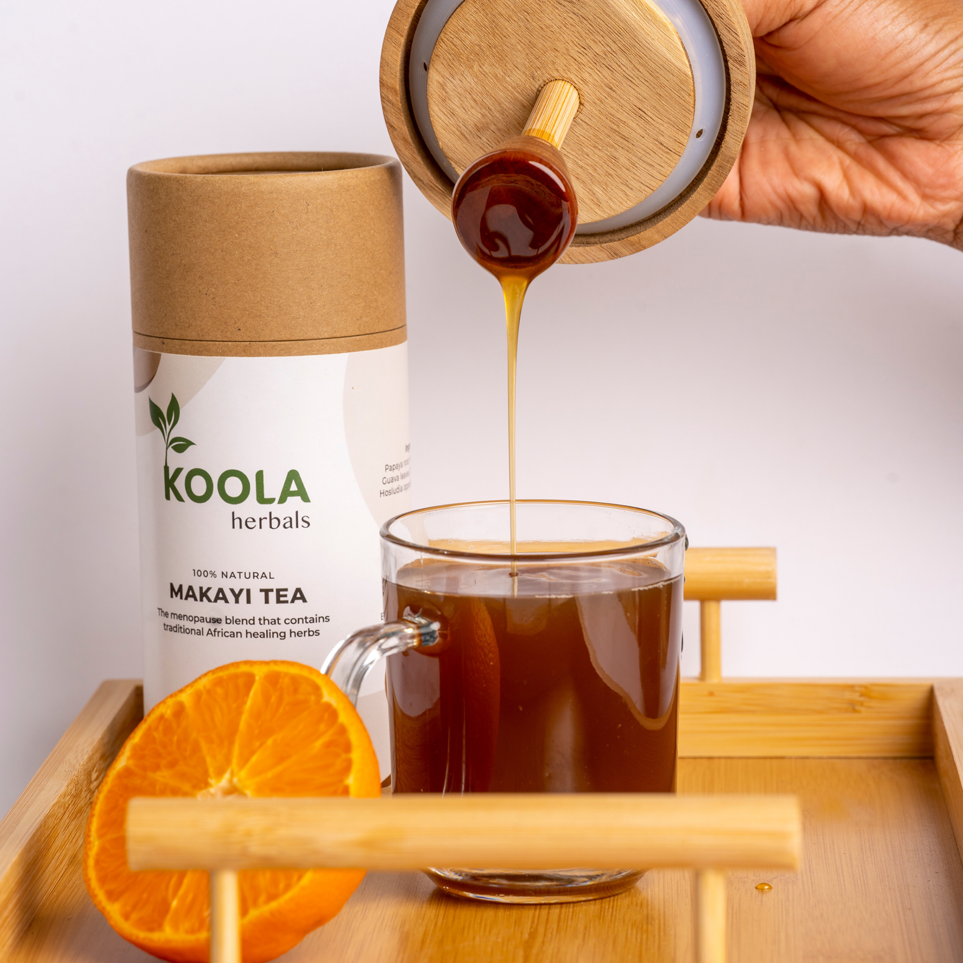 Makayi Tea kombiniert Guava leaves, Avocado leaf, und Papaya leaf um auf natürliche Weise stabilere Stimmungen zu unterstützen, indem es die Nerven beruhigt und das emotionale Gleichgewicht während der Menopause fördert.